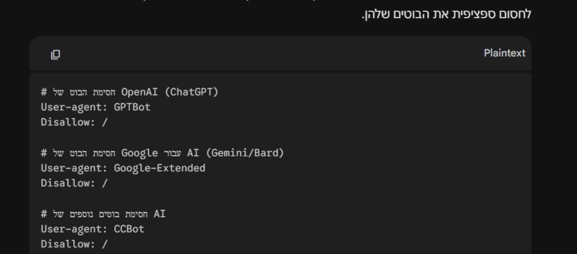קובץ שמונע מ AI לגשת לאתר שלך פחות מומלץ לקידום אורגני, המטרה שלנו ש AI ימליץ עליכם.